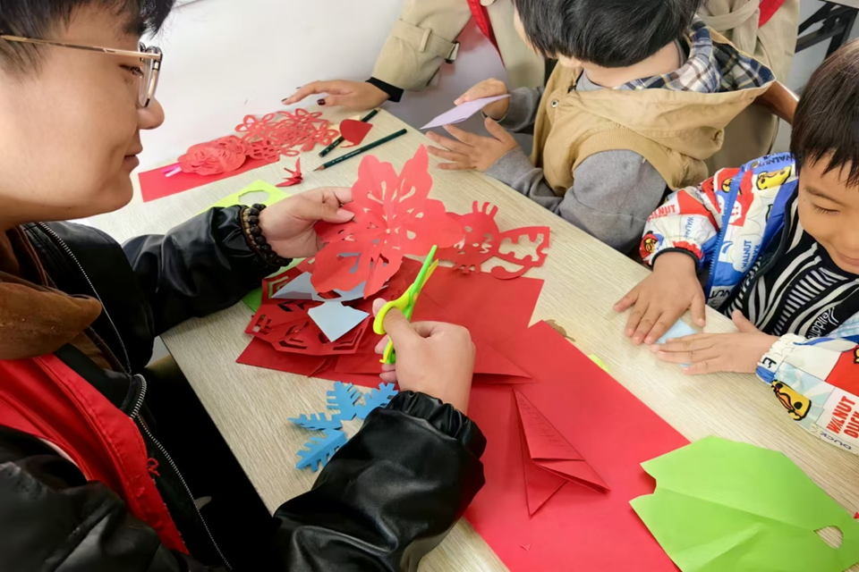 活动中,居民们与同学们一起动手剪纸,不仅感受到了剪纸的乐趣,还学习了相关园林知识。同学们根据植物形态中的线条和轮廓进行修剪,将彩纸修剪成常见的园林植物形状,如花卉、灌木、树木等,制作成美观又环保的装饰,进一步强化了居民对绿色美好生活的认识和向往。