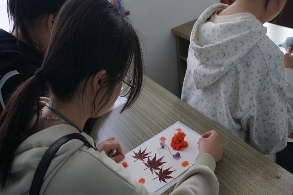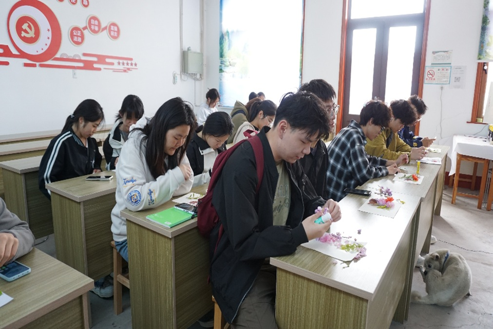 活动现场,志愿者们以落花、落叶为素材,通过拼贴、手绘等形式进行艺术创作。在创作过程中,志愿者不仅将自然之美定格于画纸,更主动参与社区环境清理,将艺术实践与劳动教育有机结合。活动结束后,社区环境得到有效改善。本次活动将专业特色与生态教育深度融合,构建起“实践—认知—责任”的育人链条,实现了资源循环与美育传播的双重价值。