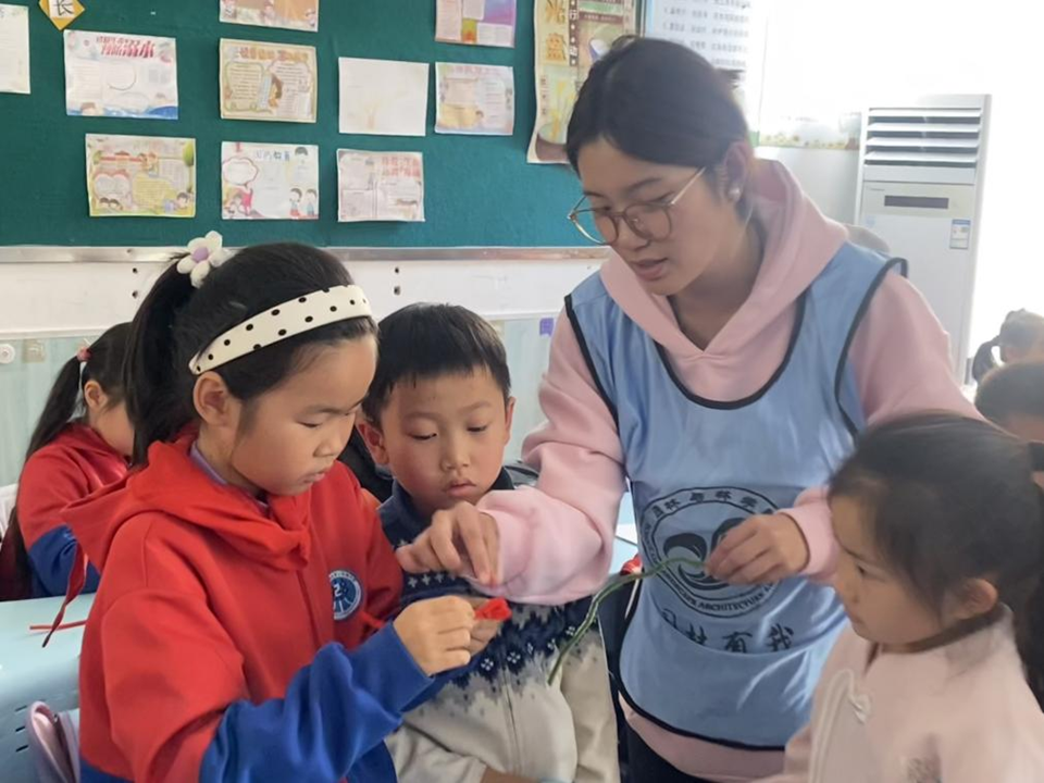 接下来最让孩子们兴奋的,莫过于手工扭扭棒环节。在志愿者们的带领下,扭扭棒在孩子们的小手中逐渐变幻出各种植物形状。红的似火的枫叶、五颜六色的小花,每一种植物都凝聚着孩子们的创意和快乐。