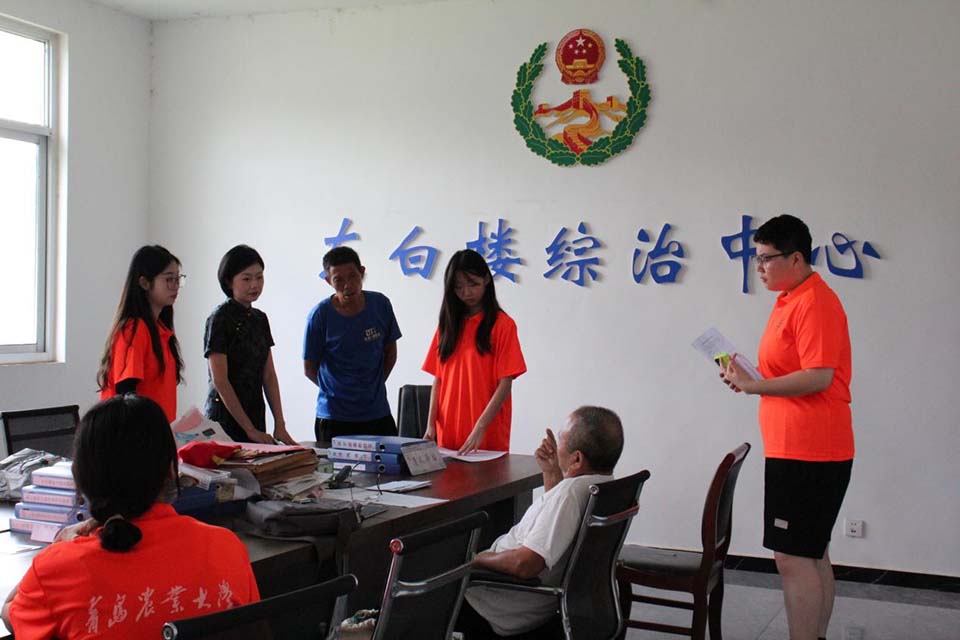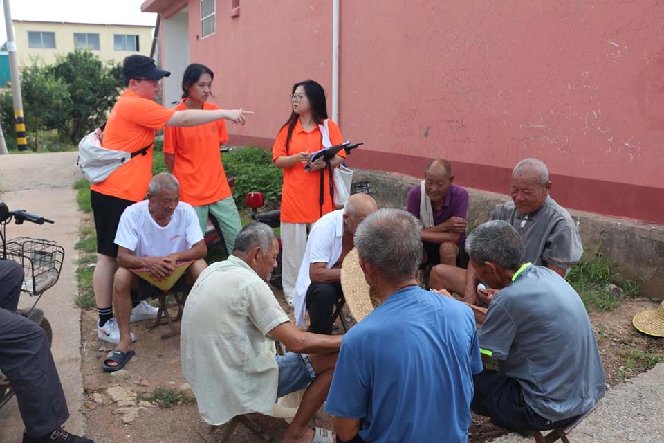 图为调研团成员在东白楼村发放调研问卷