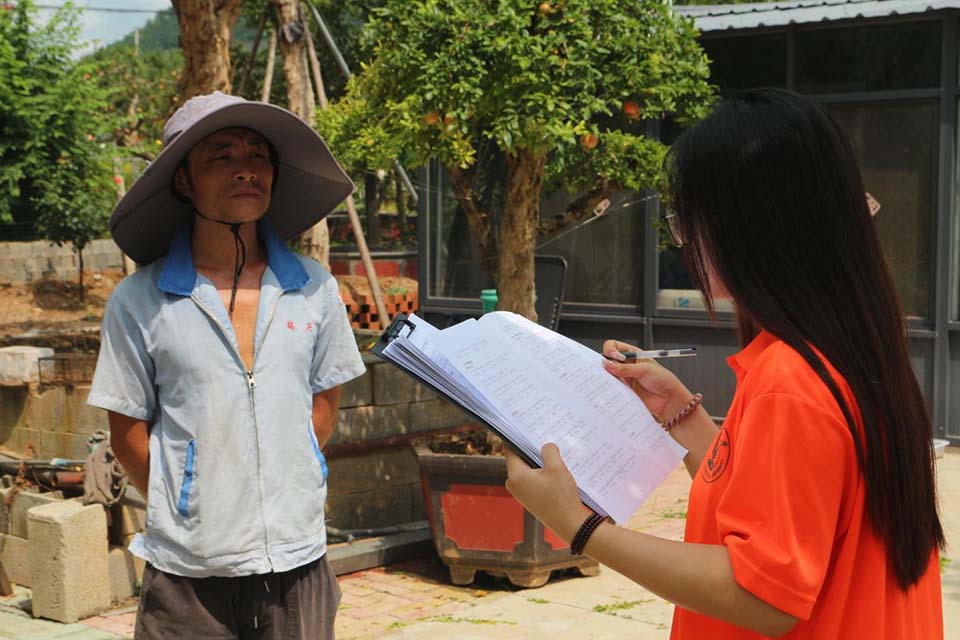 图为调研团成员深入石榴盆景农户家中发放调研问卷