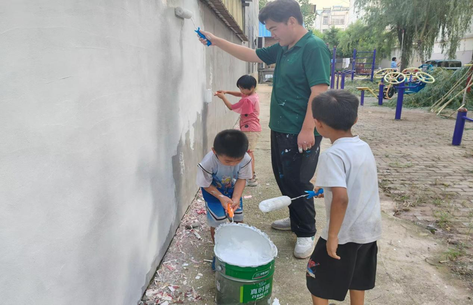 在墙绘过程中,花少实践团邀请了各村小朋友们一同参与墙绘,大手拉小手,在孩子们心中播种下美术希望的“种子”。色彩和心灵的碰撞,绘就了孩子们美好的家乡和童年记忆。队员们结合自己的专业知识,为孩子们详细讲解绘画要点,普及画面整体布局、色彩搭配等基础知识,带领孩子们展开联想作画,引导和鼓励他们用线条和色彩展示自己对家乡的认识。