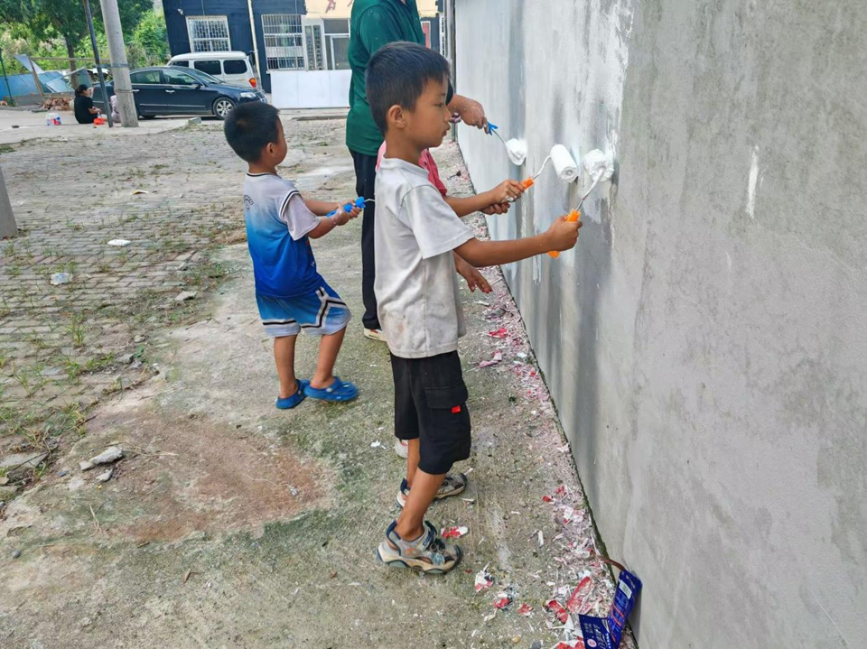 传送希望,播种明天。“乡”约平邑地方,在墙绘过程中,花少实践团邀请了各村小朋友们一同参与墙绘,大手拉小手,在孩子们心中播种下美术希望的“种子”。色彩和心灵的碰撞,绘就了孩子们美好的家乡和童年记忆。队员们结合自己的专业知识,为孩子们详细讲解绘画要点,普及画面整体布局、色彩搭配等基础知识,带领孩子们展开联想作画,引导和鼓励他们用线条和色彩展示自己对家乡的认识。本次活动让孩子们充分感受到家乡的形之韵、色之丰,同时也提高了他们自身的思考能力和动手能力。