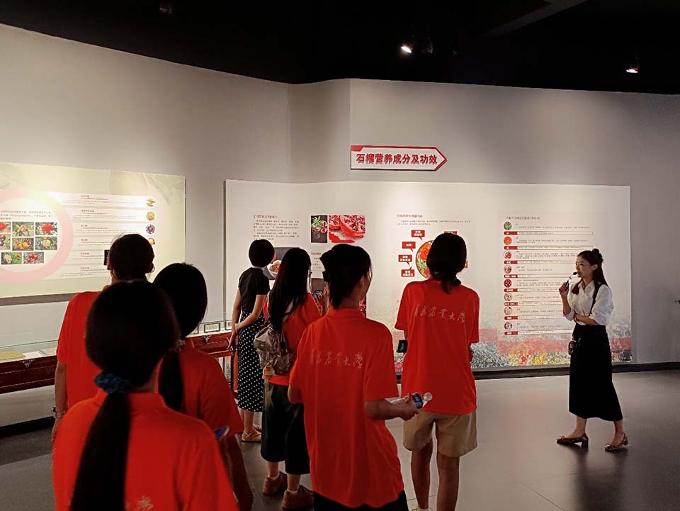 8月1日下午,实践团参观了中华石榴文化博览园,这是国内唯一的石榴国家林木种质资源库和国内首座石榴专题博物馆,目前博览园保存了473份来自全球的石榴种质,保存数量全国第一。在讲解员介绍下,实践团深入了解了全球石榴文化、种质资源收集保存、创新利用和产业发展情况,加深了对石榴文化的理解和认识,激发了对农业科技创新和地方经济发展的热情和信心。