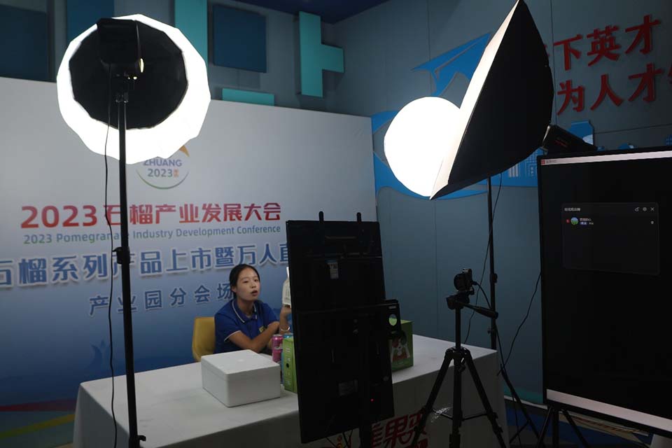 图为王老吉石榴大健康产业园工作人员正在进行线上直播