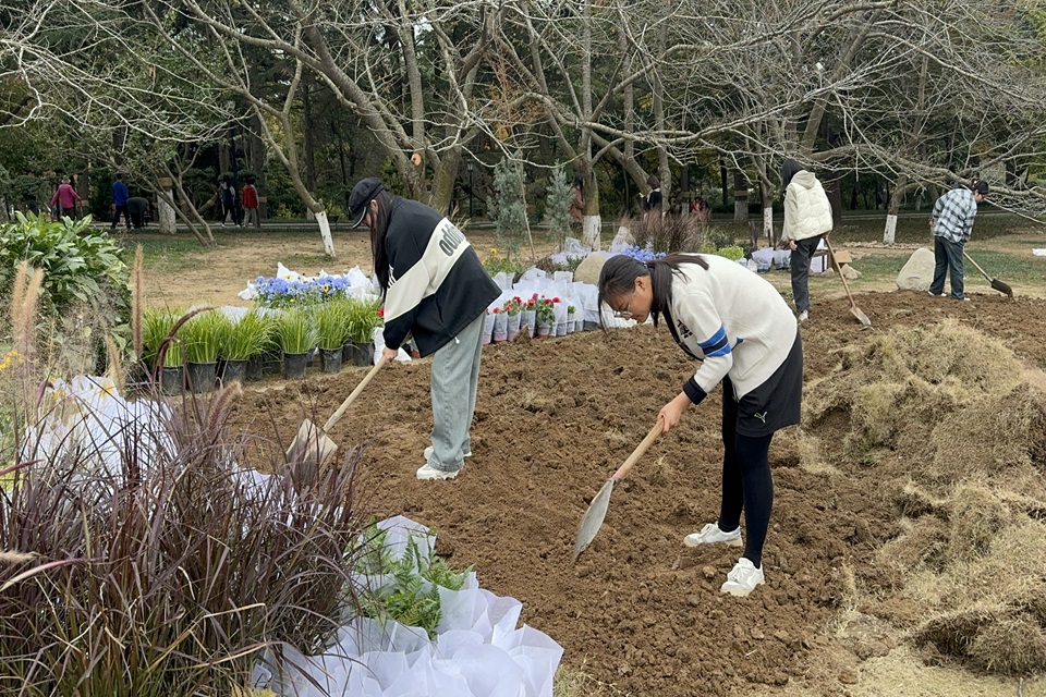 劳动过程中,同学们根据尊重、顺应、保护自然的生态理念,秉持提升园林素养的初衷,充分发挥创新思维与动手能力,为城市绿色建设添砖加瓦。实践队伍首先完成清理场地等前期准备工作,为实践方案落地做好准备,随后因地制宜完成种植定位,明确各种植物种植区域,根据要求选择适宜花卉种植,并完成植物支撑与固定,实现团队设计方案的花镜造景。