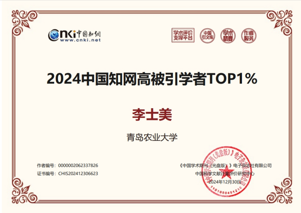 中国知网中国科学文献计量评价研究中心基于中国知网收录的10年(2014-2023)国内学术成果计算每位学者的单篇论文引证标准化指数(Paper Citation Standardized Index,简称 PCSI),2024年首次开展学者学术影响力客观评价,遴选了“2024中国知网高被引学者”名单,助力优秀成果的国内首发。betway西汉姆联官方网站教师李士美入选“2024中国知网高被引学者TOP1%”名单。据获悉,2024年全国约335万名作者进入初选。“2024中国知网高被引学者TOP1%”需满足:近十年发文的作者总PCSI位于初选作者范围的TOP1%,且近十年发表PCSI高于理论平均值(1.65)的论文不少于5篇以及近十年至少发表1篇高影响力论文。2024中国知网高被引学者名单详见https://xs.cnki.net/List/HCS_List。