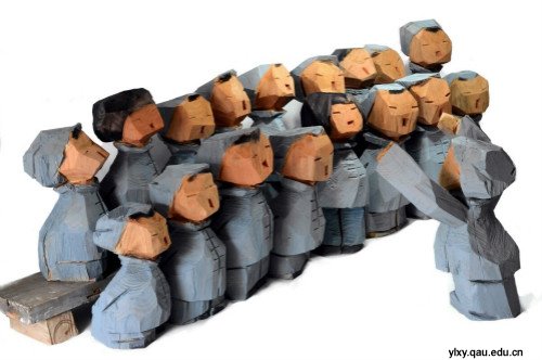 钟建老师近年来潜心研究艺术创作规律,探索多种艺术表现形式,形成了独特的艺术风格。此次入选的作品以樟木雕刻而成,由19个儿童形象组合为一个群体,表现了抗日战争时期陕甘宁边区保育院合唱表演的热烈场面。创作结合运用现代雕塑语言和中国民间艺术造型手法,以大写意式的简洁风格表现了边区儿童健康向上的面貌。