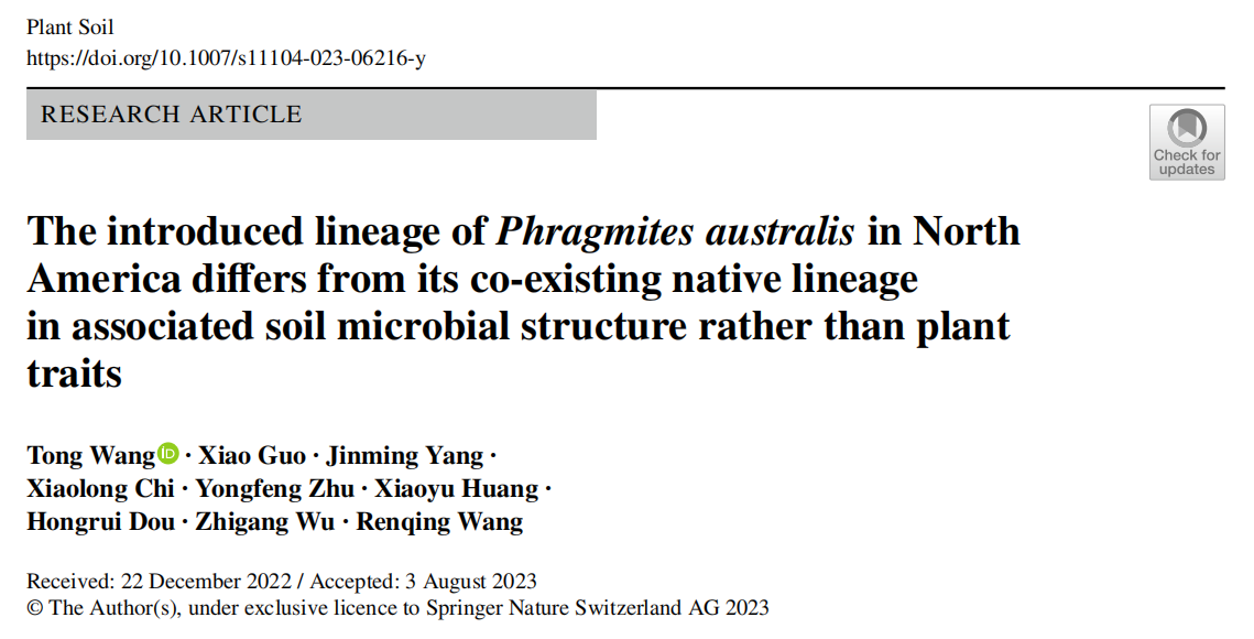 近日,生态学课题组依托世界芦苇同质种植园,于植物不同生活史阶段,系统比较了北美入侵类群(单倍型M)、北美乡土类群(单倍型E)、欧洲类群(单倍型M)与中国西北类群(单倍型M)的功能性状与根际微生物群落结构与功能,研究成果以The introduced lineage of Phragmites australis in North America differs from its co-existing native lineage in associated soil microbial structure rather than plant traits为题发表在国际期刊Plant and Soil(中科院农林科学2区TOP,IF:4.9)上。