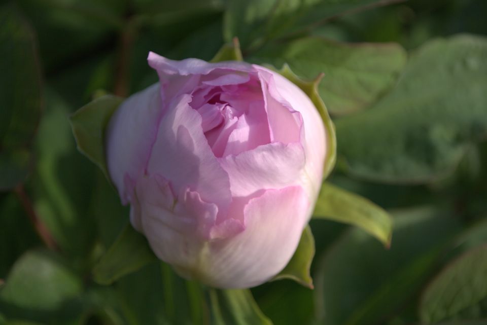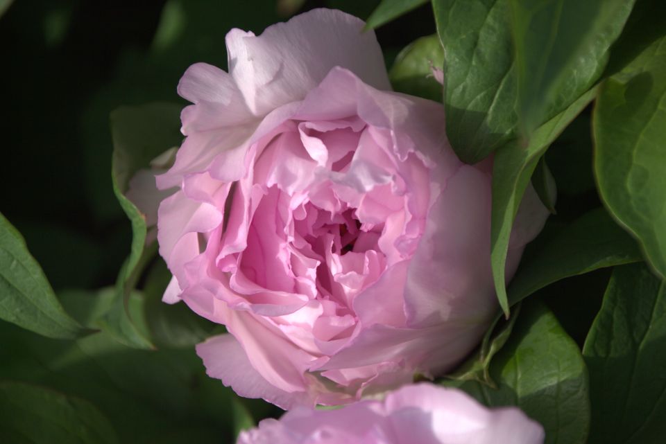 ‘青农罗伊’,株形直立,生长势强;花粉色,花瓣基部有斑,荷花型,花开于株丛外,花朵直立不垂头不藏花;花朵直径21 cm,花高6 cm;花半开期形状三角形,收拢,形似玫瑰,且1年生枝长60 cm左右,适合作为切花和园林绿化观赏使用。