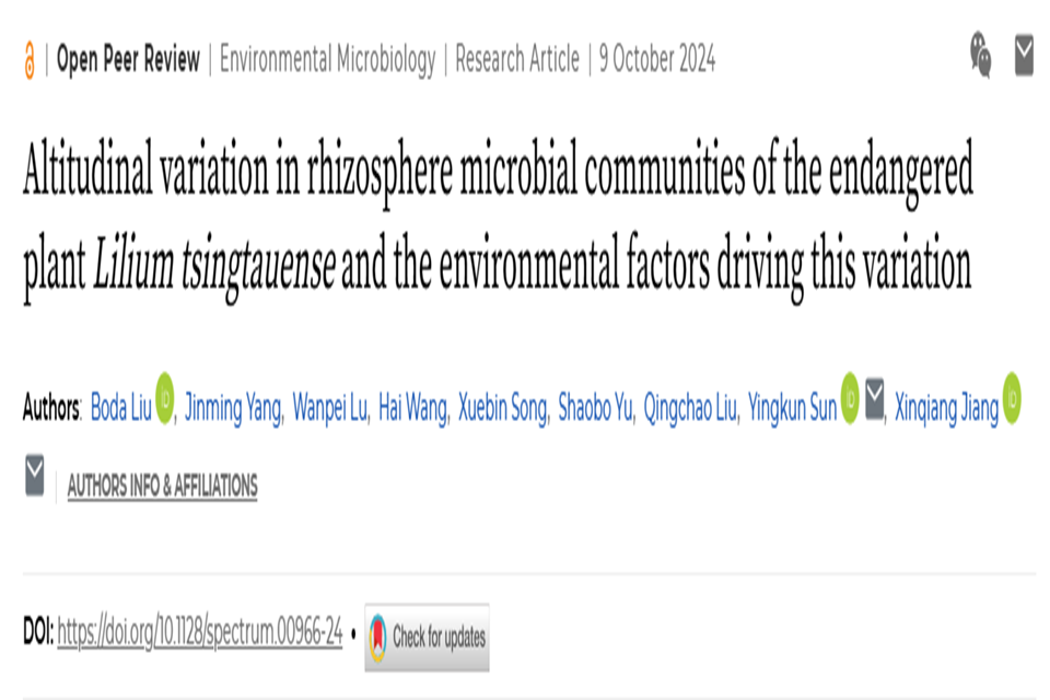 近日,青岛百合研究团队在前期对崂山地区野生青岛百合分布本底调研的基础上,根据青岛百合在崂山的分布特征,探究了三种海拔高度下青岛百合根际微生物群落变化和驱动微生物群落变化的环境因素。研究成果以“Altitudinal variation in rhizosphere microbial communities of the endangered plant Lilium tsingtauense and the environmental factors driving this variation”为题发表在国际期刊Microbiology Spectrum(中国科公司生物学大类2区,IF:3.7)上。