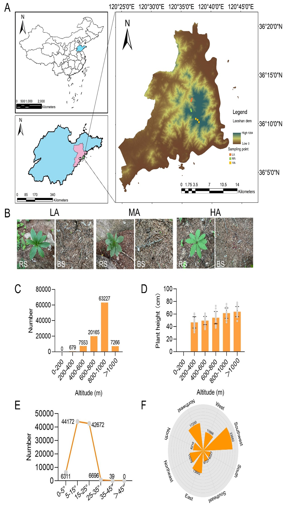 该研究发现,崂山不同海拔[高海拔(800-1,000 m),低海拔(400-600 m)和中海拔(600-800 m)]处的野生青岛百合数量和植株高度呈现不同的分布特征,在 5°-35° 的西北和西南坡上青岛百合分布最为丰富。这些结果表明,高海拔和阴坡方向可能更适合青岛百合的生长(图1)。