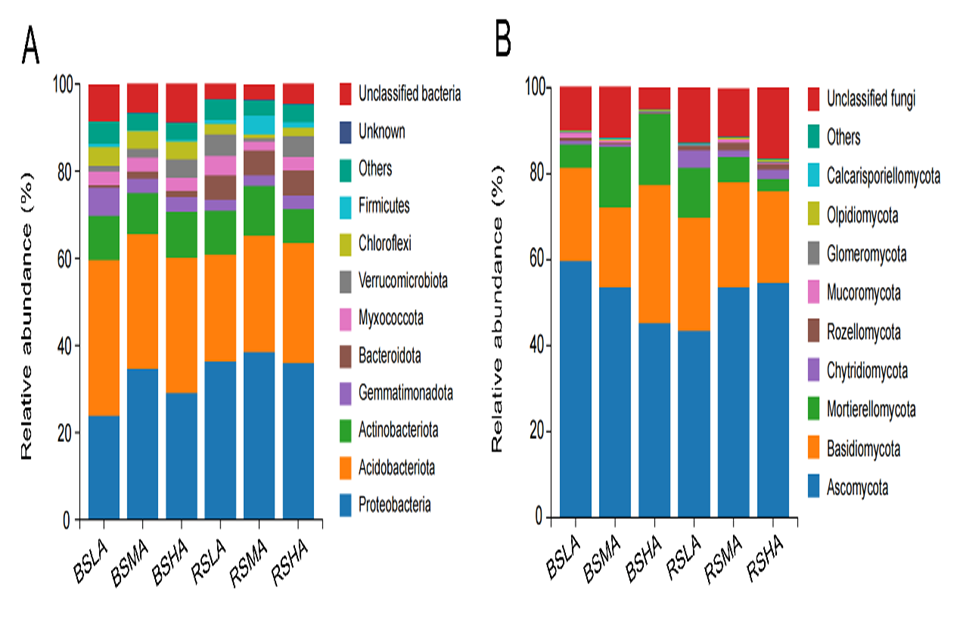研究人员进一步对不同海拔下青岛百合根际和非根际的土壤微生物种类进行了研究,发现变形菌门和酸杆菌门是青岛百合根际与非根际土壤中的优势细菌门种类,子囊菌门和担子菌门是青岛百合根际与非根际土壤的优势真菌门种类(图2)。
