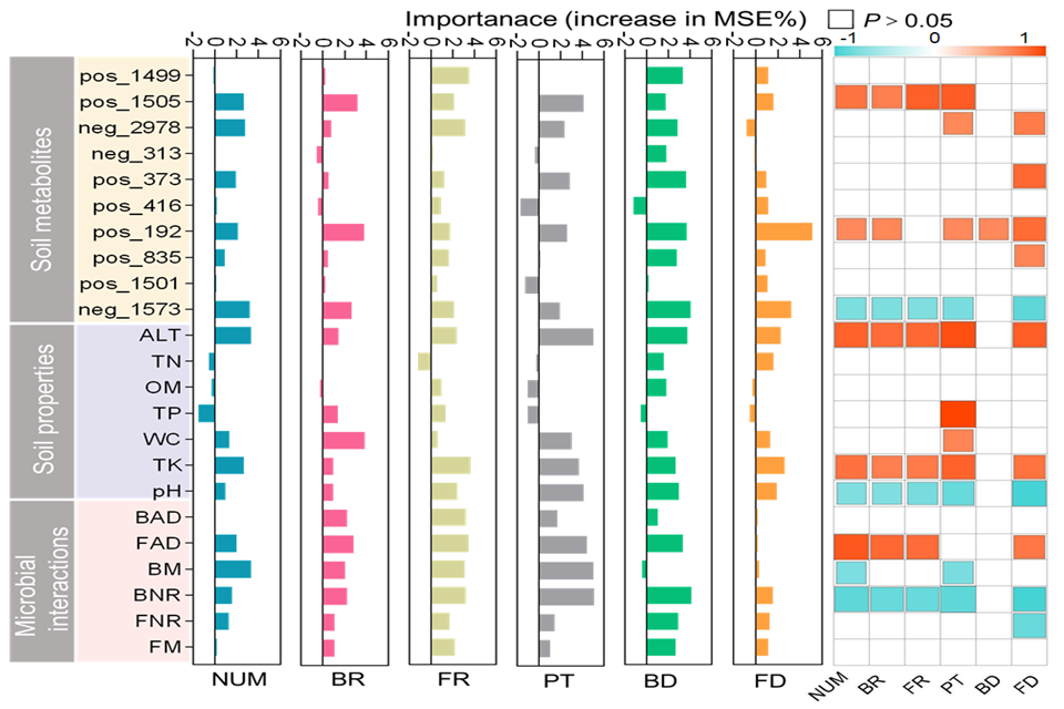 采用随机森林模型和相关性分析对青岛百合的生长特性与微生物群落进行了分析,发现一系列微生物分类群(如酸杆菌科、黄杆菌科、曲霉科和链霉菌科)及土壤代谢物(如磷脂酰胆碱和磷脂酰丝氨酸)可能是青岛百合栖息地的重要预测因子。这些环境因素在塑造青岛百合根际微生物群落结构方面起重要作用。