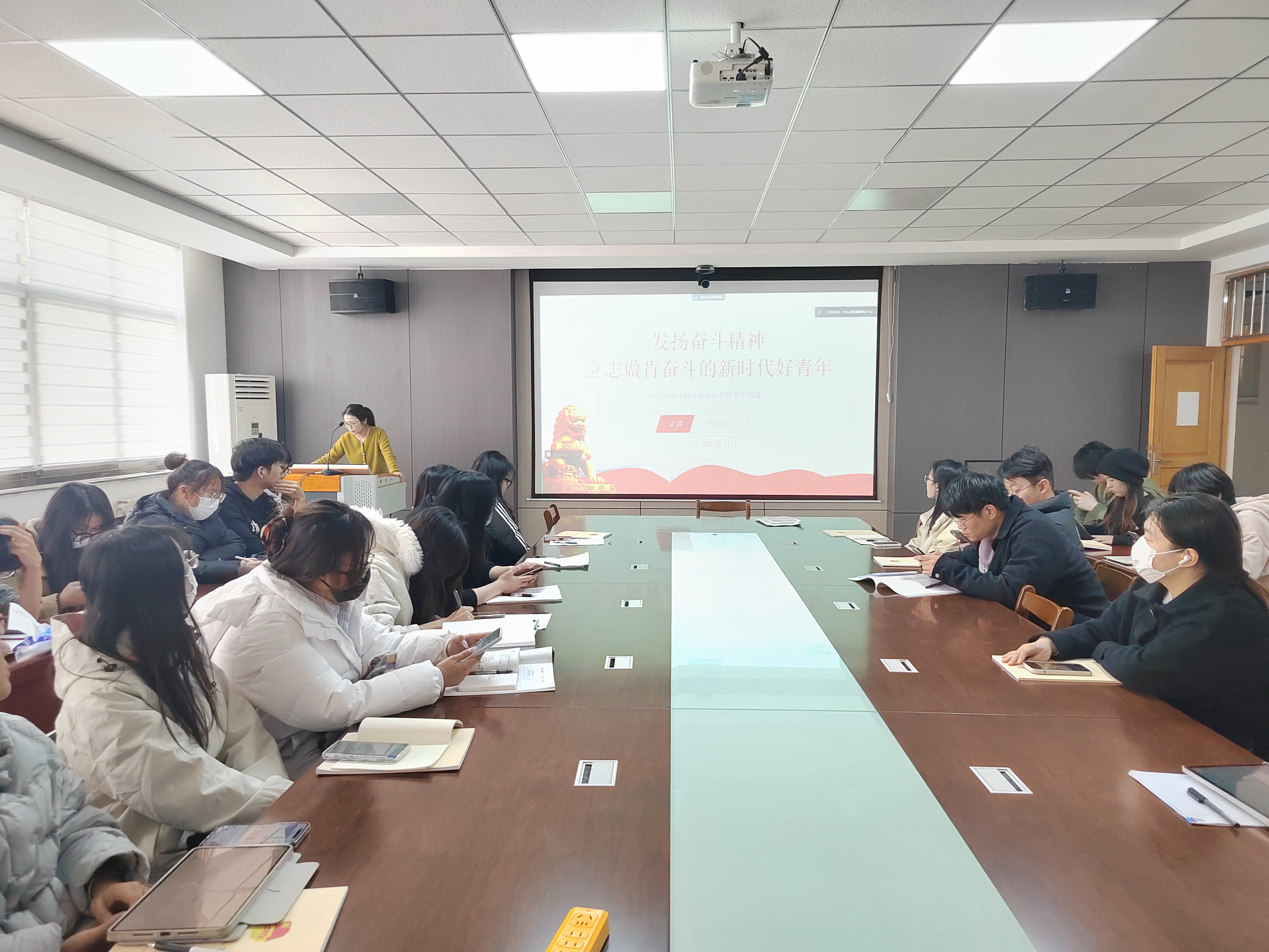 本次团课分为“锤炼奋斗品质”“激发奋斗热情”“增强奋斗本领”三个部分。许菲菲指出奋斗精神是中国人与生俱来的优秀品质,新时代青年要接过奋勇前行的接力棒,传承好中国共产党人的奋斗精神。她鼓励员工干部要率先发挥奋斗的主观能动性,通过传承和弘扬红色文化,学习先进典型,激发奋斗热情。最后,许菲菲殷切鼓励同学们积极参与创新创业竞赛,勤思好学,不惧试错,敢于突破自我,不断增强奋斗本领。