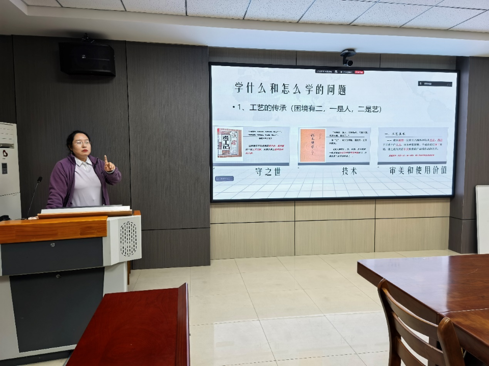 本次培训由风景园林系闫晓燕老师主讲,她以“传承与认同”为题,分享了《中国工艺美术史》课程中融入思政元素的指导思想和具体措施,通过传统工艺传承与保护、工艺美学表达和体验、传统文化认知重塑以及提升文化自信和专业认同四个方面,提出筛选历史素材、弘扬传统精神和树立文化自信三个重要抓手。从课程内容与专业特点等角度出发,为风景园林系教师贯彻落实课程思政带来了实践启发与行动指南。