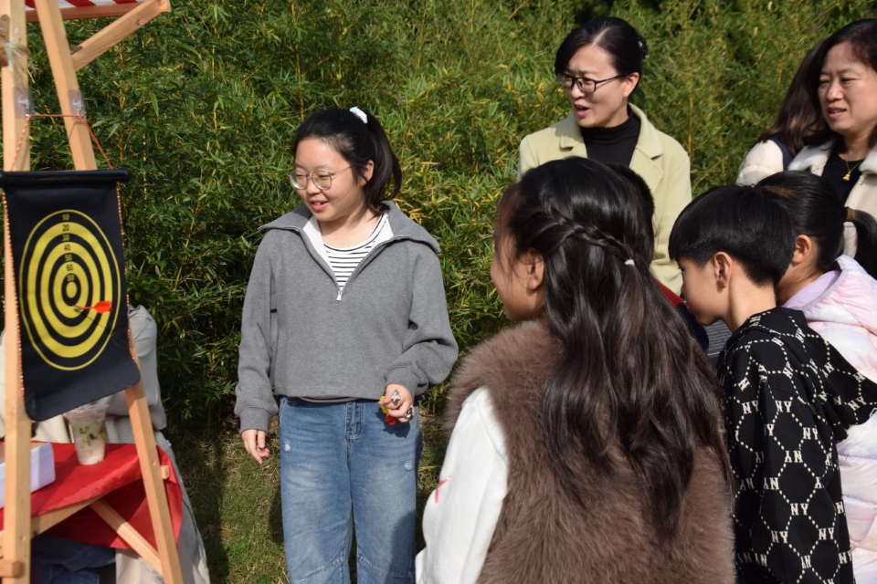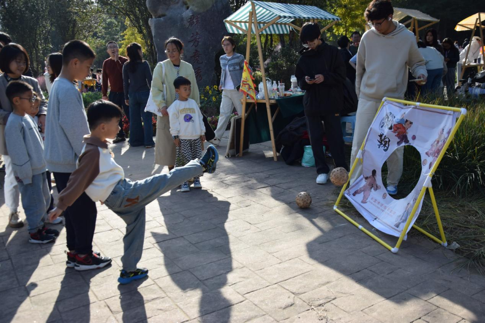 “烂漫意趣・享秋”板块注重互动娱乐与团队协作,八项趣味活动点燃现场氛围。蹴鞠挑战区,师生们脚踩传统皮质蹴鞠,在传球、射门中感受古代运动的活力;植物粘贴活动里,大家用花草制作特色面具,释放创意灵感;成语猜谜、沙包诗会等活动,将文化知识融入游戏,让参与者在轻松氛围中学习积累;飞镖挑战、互动游戏等则成为师生放松身心、增进交流的纽带。
