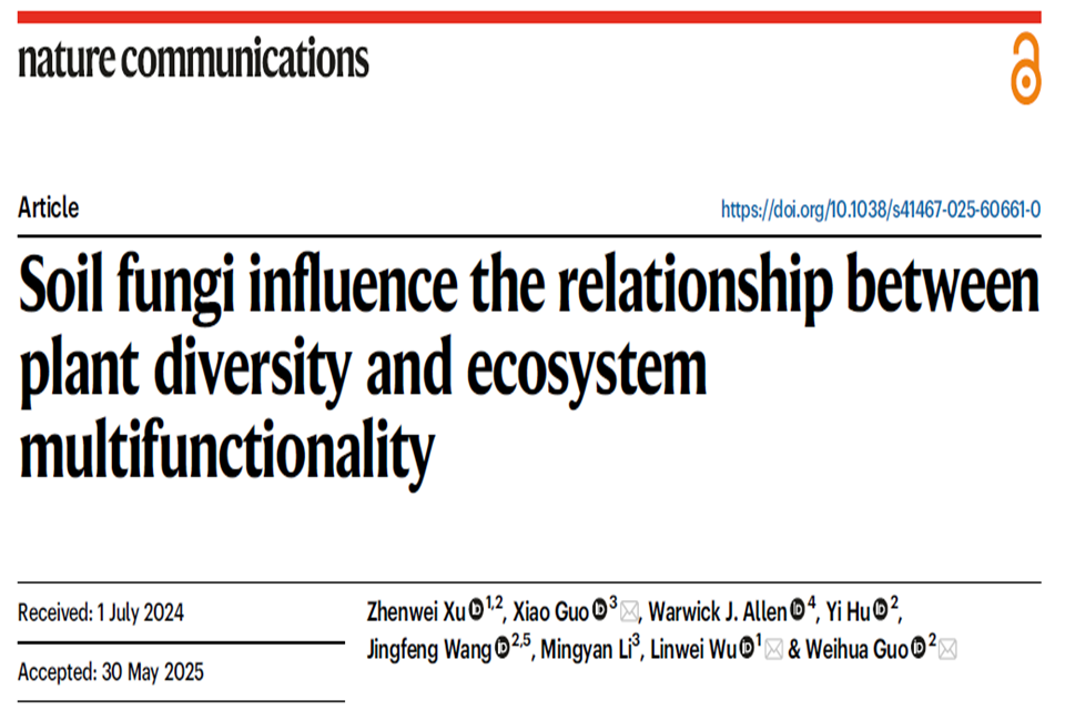 近日,betway西汉姆联官方网站郭霄课题组与山东大学郭卫华课题组、北京大学吴林蔚课题组合作在国际顶级期刊《Nature Communications》(一区Top期刊,IF=15.7)上发表研究性论文“Soil fungi influence the relationship between plant diversity and ecosystem multifunctionality”,该论文主要研究了土壤真菌多样性对植物多样性-生态系统多功能性的驱动机制。