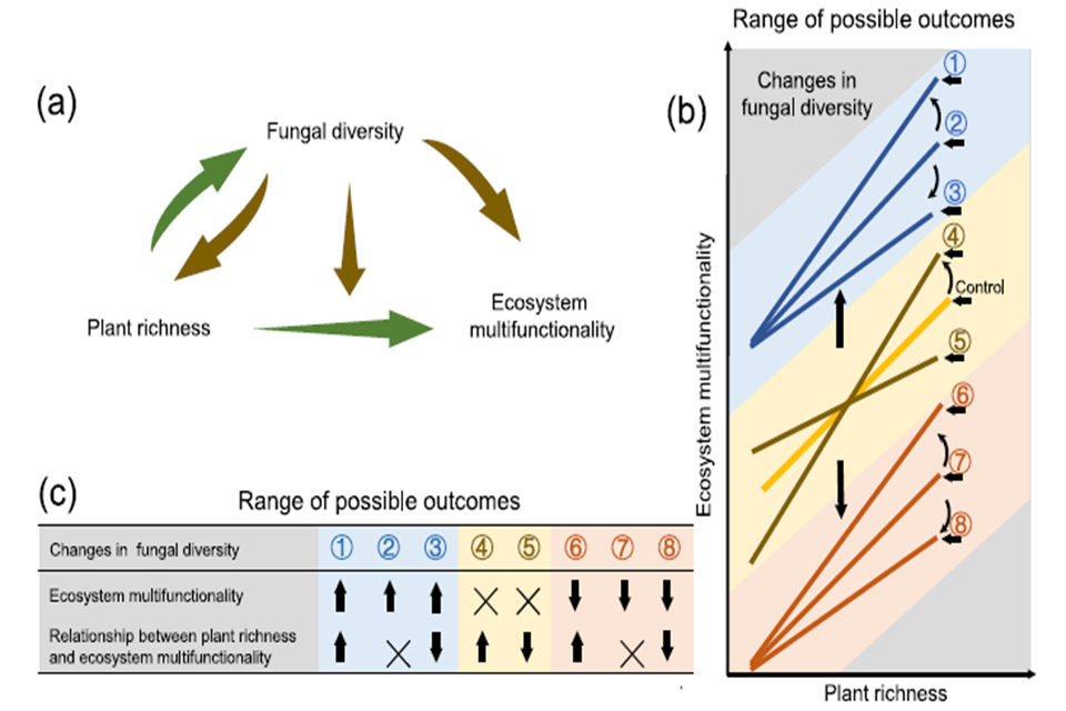 土壤真菌对植物多样性与生态系统多功能性的关系的潜在影响模式图